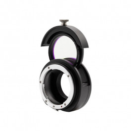 Si solo utilizas un filtro para tus sesiones de fotografía, este tipo de portafiltros es una alternativa económica a las ruedas portafiltros. ZWO ofrece este sistema de dos piezas en su catálogo: un portafiltros con rosca macho M42 en el lado de la cámara/montura de bayoneta compatible con Nikon y un cajón extraíble para filtros cilíndricos de 50,8 mm.