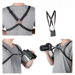 Correa tipo arnés para sujetar de forma segura y cómoda sus prismáticos a su cuerpo, pudiendo liberar ambas manos cuando no los esté usando.