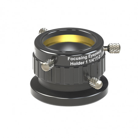 El Sujetaocular con enfoque de Baader Planetarium es un ocular que se sujeta a través de varios tornillos y un aro de compresión, que fija el casquillo de 31,7 mm, se rosca a T2 por un lado y por el otro a 31,7 mm.