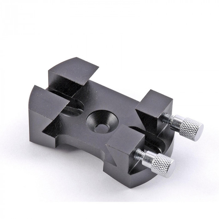 La sujeción del buscador se realiza con dos tornillos, de forma que queda totalmente fijada y sólida. Fabricada en aluminio mecanizado y anodizado negro.