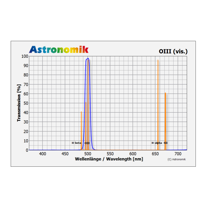 Debido al estrecho medio ancho con alta transmisión simultánea en el área de las líneas OIII, logra un mayor aumento de contraste que los filtros con un mayor ancho de banda.