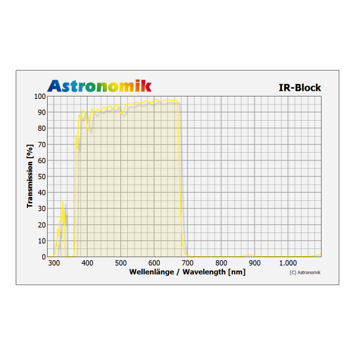 Este filtro está diseñado para el bloqueo del infrarrojo. Este filtro ideal para cámaras que no tienen una sensibilidad UV apreciable. Se trata principalmente de webcams, cámaras industriales (Mintron, DMK sin filtro de infrarrojos) y LPI o DSI de Meade. Con un bloqueo de infrarrojos, se evita una imagen fantasma borrosa.