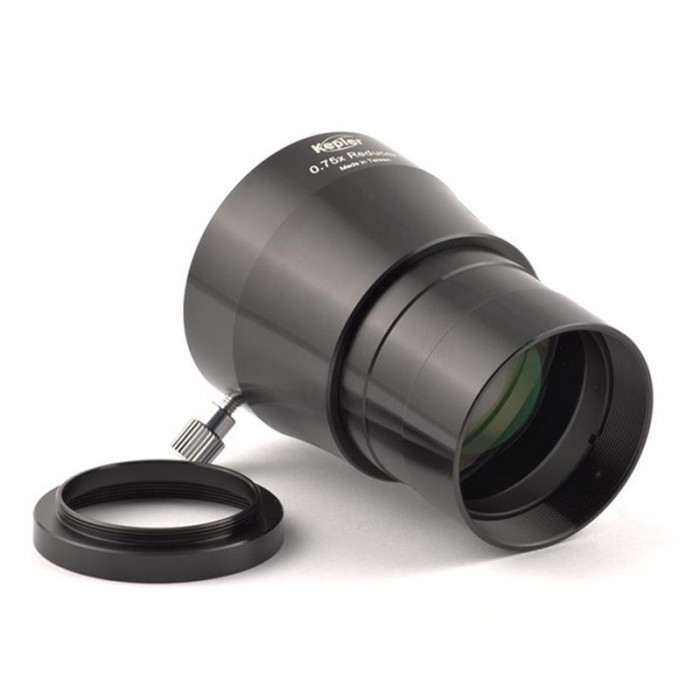 El reductor de focal de Kepler está diseñado para reducir la distancia focal de los telescopios Richey-Chrétien en 0.75x, mientras se aplana el campo a 18 mm. El enfoque óptimo es de 80 mm desde el borde del reductor. Viene con un adaptador de 50.8 mm y un adaptador de rosca T2.