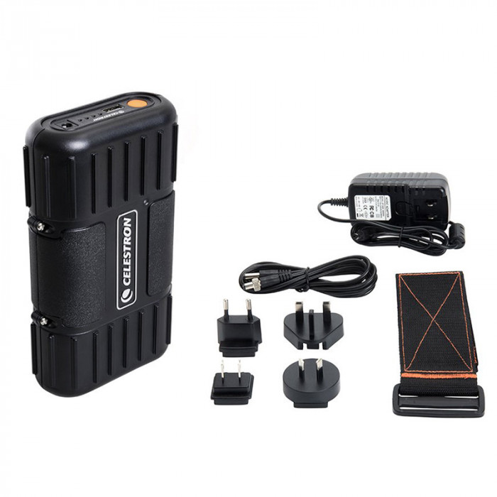 Nuevo Powertank Lithium Celestron LT más compacto, liviano y portátil. El circuito de regulación de 12 voltios incorporado proporciona a su telescopio hasta 8 horas de potencia constante al voltaje adecuado para un rendimiento óptimo del telescopio. Viene con un puerto USB de carga rápida para cargar rápidamente sus dispositivos electrónicos. Cumple con las regulaciones actuales de equipaje de mano de la FAA.