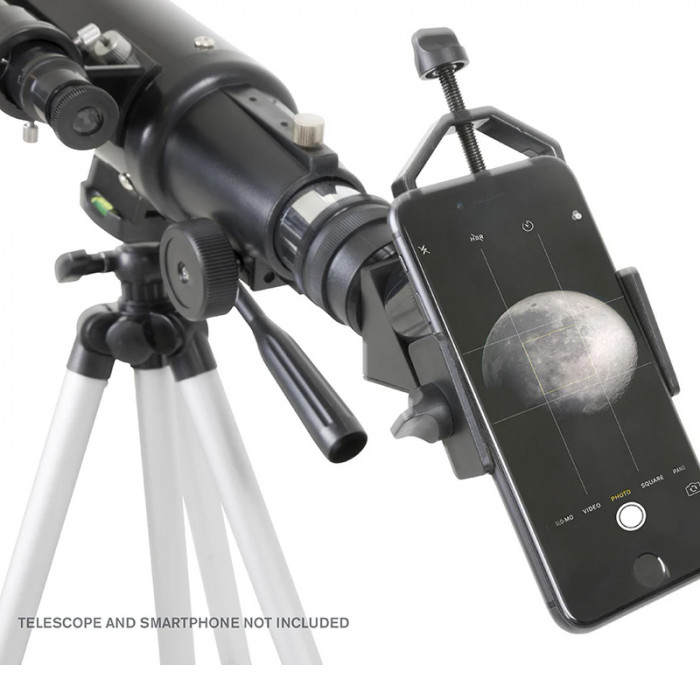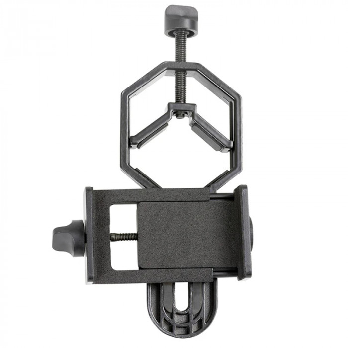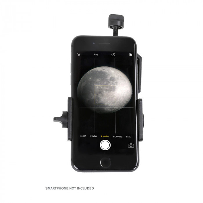 Este adaptador de teléfono se instala fácilmente al sujetarlo sobre la parte superior de un ocular. El teléfono se mantiene en posición con la ayuda de las perillas que bloquean firmemente el teléfono en su lugar. Es posible que se deban quitar algunas carcasas de teléfonos grandes y / o voluminosas (incluidas las de estilo folio) para que el teléfono encaje en el adaptador.