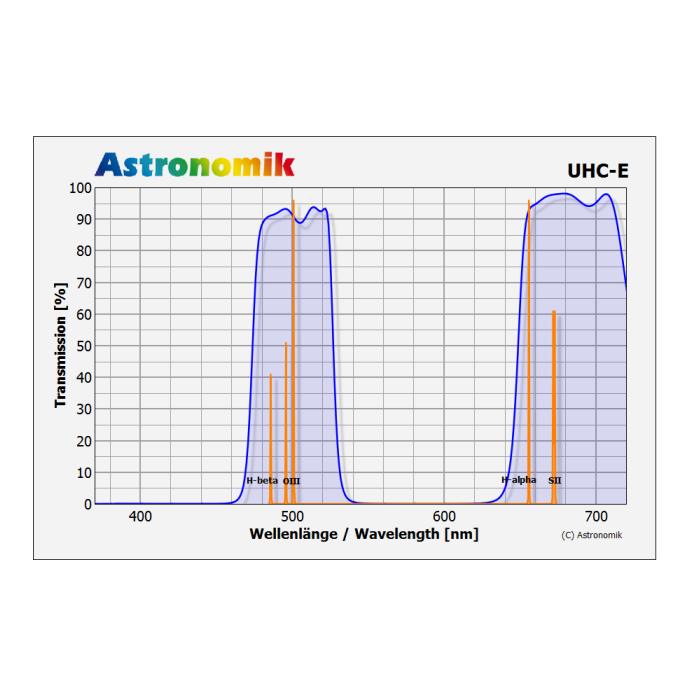 El filtro Astronomik UHC-E proporciona un FWHM de 45 nm y bloquea la luz de las farolas típicas (por ejemplo, vapor de sodio y mercurio). Por lo tanto, aumenta el contraste entre su objetivo y el cielo nocturno. La mejora del contraste es menor que la del filtro Astronomik UHC, pero al mismo tiempo la cantidad transmitida de luz estelar es mayor. Por lo tanto, es más adecuado para telescopios más pequeños. A medida que el filtro UHC-E pasa una línea espectral de carbono (debido a la mayor FWHM), abre la posibilidad de observación de cometas.