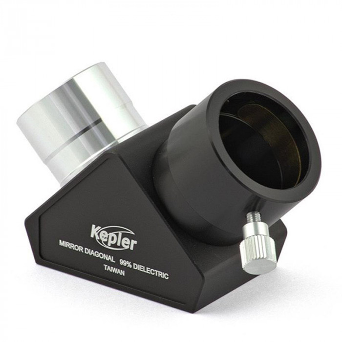 Este diagonal dieléctrico de 90 grados Kepler de 1.25" y de alta calidad en espejo, está totalmente multitratado consigue un excelente coeficiente de reflexión del 99%, para ofrecer imágenes de máximo brillo, y cuenta con un anillo de presión de latón que sujeta el ocular con total seguridad sin dañar el barrilete, es ideal para refractores.