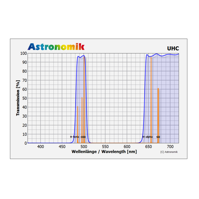 El filtro Astronomik UHC (Ultra High Contrast) permite la transmisión de casi el 100% de la radiación de las líneas O-III y H-Beta. Aunque la segunda ventana para la línea H-Alpha no está destinada a la observación visual, es importante si el filtro se usa con un dispositivo electrónico. Toda la luz dispersa molesta de otras fuentes de longitud de onda, incluida la contaminación lumínica artificial local, se filtra de forma fiable. Con este fuerte bloqueo del fondo del cielo, tendremos una riqueza inesperada de detalles que se vuelven visibles para las nebulosas de gas y las nebulosas planetarias.