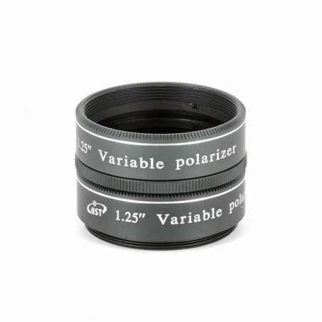 Filtro polarizador variable Kepler con un factor de transmisión de del 1% al 40%. El alto brillo de la Luna, especialmente durante las fases gibosas, a menudo hace que el uso de un filtro atenuador sea esencial. Generalmente neutros, los filtros polarizadores variables se utilizan para reducir el deslumbramiento del usuario, un resplandor que no presenta ningún peligro pero que se vuelve molesto durante las observaciones prolongadas, pudiendo adaptar la intensidad del filtrado según la fase lunar.