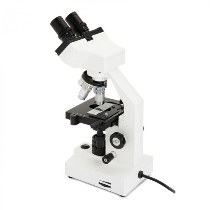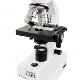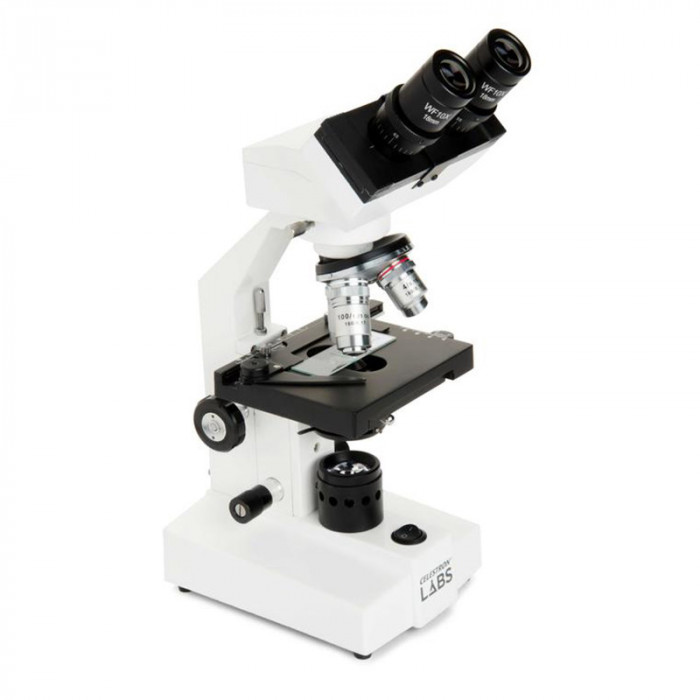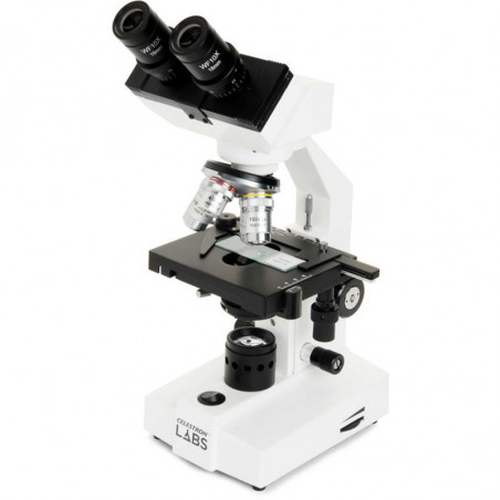 El microscopio Celestron Labs CB2000CF ofrece los últimos avances de hoy en día en microscopios a un precio económico, éste modelo incorpora un cabezal ajustable de tipo binocular, además de la iluminación inferior regulable con halógeno que proporciona colores brillantes, naturales, aunque sin embargo se mantiene fría al tacto.