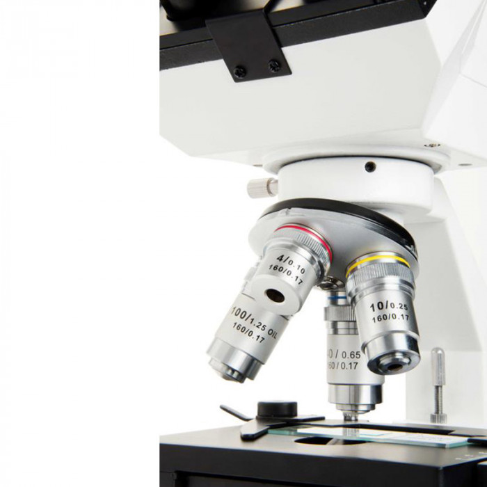 - 4 objetivos acromáticos de 4x, 10x, 40x y 100x montados en un revólver giratorio.
