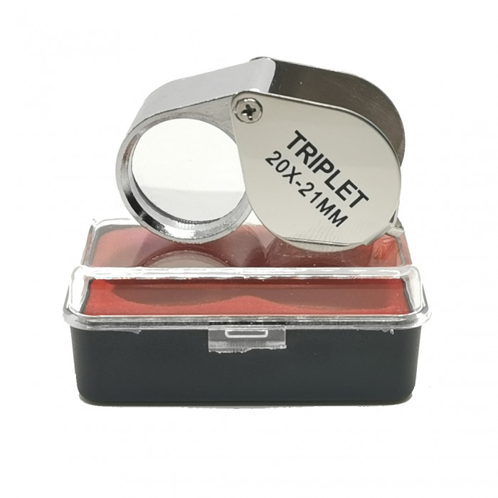 Lupa plegable metálica de bolsillo con su propio estuche de almacenamiento, también equipada con un pequeño lazo y cordón de 45 cm de color gris para llevarla sujeta al cuello.