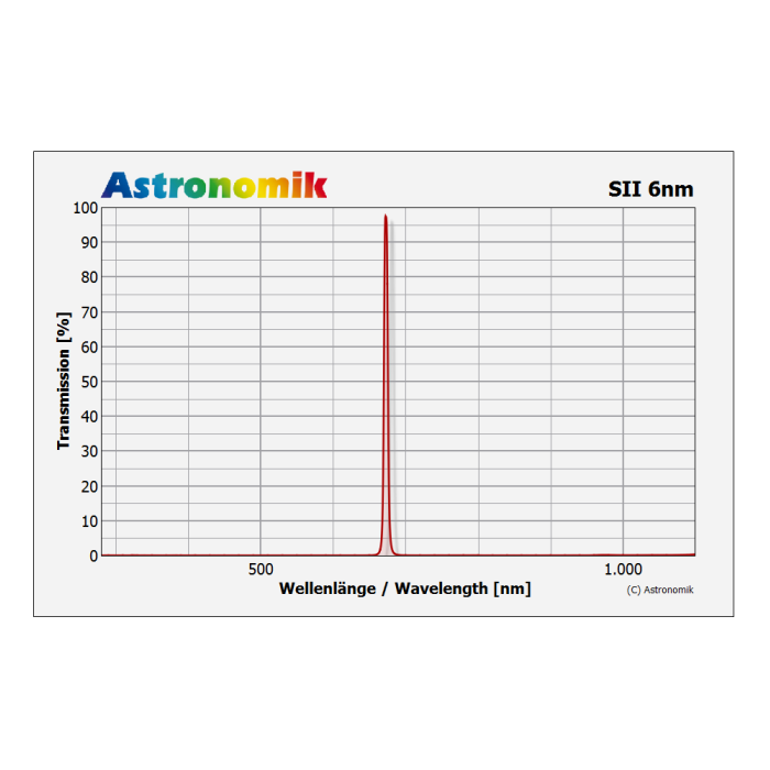 Los contrastes entre los objetos que brillan a la luz de la línea de azufre a 672 nm y el fondo del cielo se intensifican enormemente. El filtro SII-CCD de 6 nm aumenta el contraste entre las nebulosas de hidrógeno y el fondo del cielo de forma extrema. Debido a la combinación de un ancho medio bajo y una alta transmisión de casi el 100% en el área de la línea SII, el filtro entrega una señal máxima en la longitud de onda deseada, pero bloquea todas las demás radiaciones y, por lo tanto, asegura un cielo extremadamente oscuro.