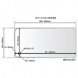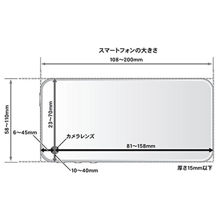 Los teléfonos con un tamaño entre 58 mm y 110 mm de ancho (longitud de eje menor) y entre 108 mm y 200 mm de altura (longitud de eje principal) se pueden conectar con este adaptador. El teléfono debe tener un grosor de menos de 15 mm.