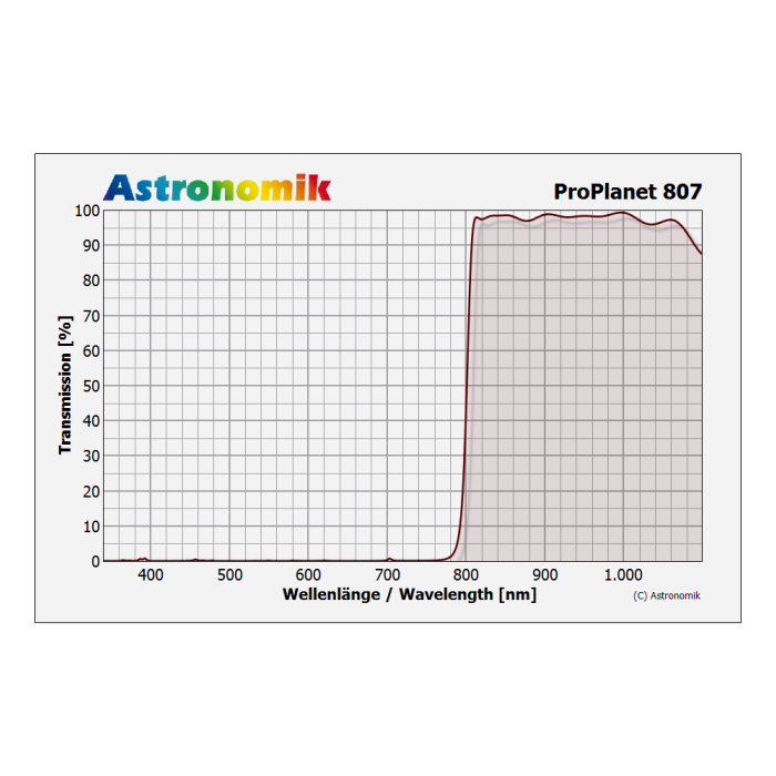 El filtro ProPlanet IR 807 corta la parte visible del espectro y solo se abre a partir de una longitud de onda de 807 nm. Como resultado, las áreas de luz que son particularmente sensibles a la visión se bloquean y las áreas de luz de onda larga que son significativamente menos sensibles a la visión pueden pasar. Este procedimiento reduce visiblemente los problemas de visión en la fotografía planetaria y lunar, sin una pérdida significativa de sensibilidad por parte del sensor de imágenes.