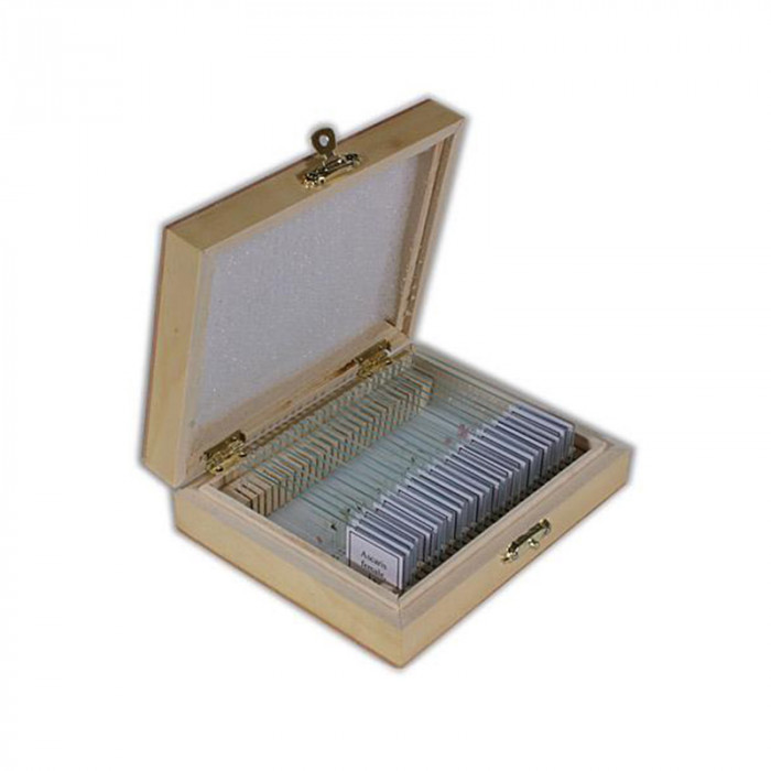 Caja de 100 muestras preparadas de TS-Optics para observar con un microscopio biológico, separadas en 4 cajas de madera con 25 preparaciones cada una. Se trata de muestras de anatomía, botánica, mixtas y de zoología, para que nos podamos iniciar fácilmente en la observación de muestras difíciles de conseguir o incluso de preparar.