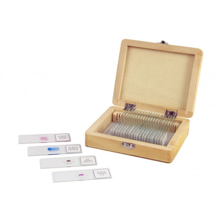 Caja de 25 muestras preparadas de Celestron para observar con un microscopio biológico. Se trata de una mezcla de muestras de minerales, vegetales y animales (se incluyen también partes de insectos) para que nos podamos iniciar fácilmente en la observación de muestras difíciles de conseguir o incluso de preparar.