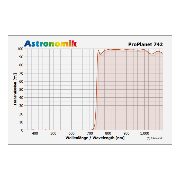 Los Astronomik ProPlanet IR 742 corta la parte visible del espectro y permite que la luz de longitudes de onda más larga que 742nm puedan pasar. Este enfoque tiene una gran mejora de la imagen de los planetas y la luna. La imagen es más estable que la imagen en luz visible con tiempos de exposición casi idénticos.