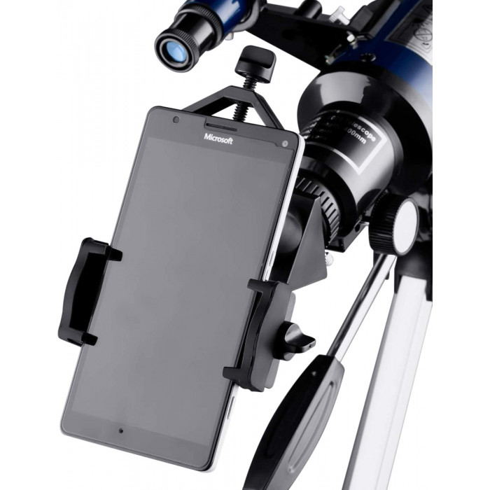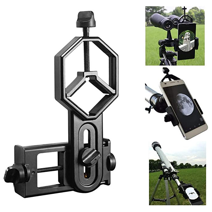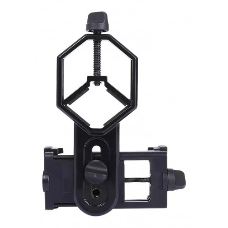 Este adaptador de teléfono se instala fácilmente al sujetarlo sobre la parte superior de un ocular. El teléfono se mantiene en posición con la ayuda de las perillas que bloquean firmemente el teléfono en su lugar. Es posible que se deban quitar algunas carcasas de teléfonos grandes y / o voluminosas (incluidas las de estilo folio) para que el teléfono encaje en el adaptador.