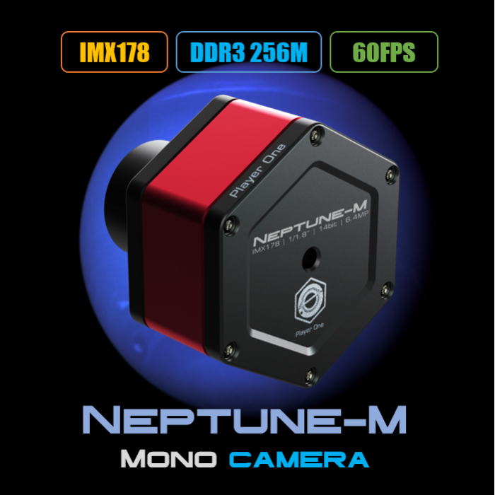 Neptune-M es una cámara planetaria desarrollada por Player One Astronomy, que adopta el sensor Sony IMX178 de formato 1/1,8”. El tamaño de píxel de 2,4 um se adapta a una profundidad de 15 ke con un total de 6,4MP (la resolución es 3096 x 2078) y la diagonal es de 9 mm.
