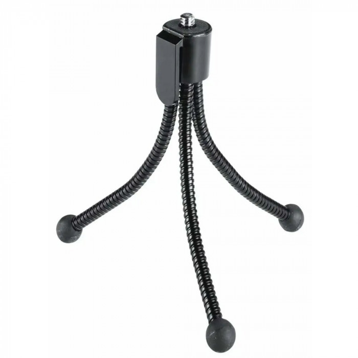 Trípode mini Hama "Flexi M" recomendado para usar con cámaras compactas o con soportes para teléfonos. Tiene las patas flexibles para poder colocarlo en cualquier superficie.