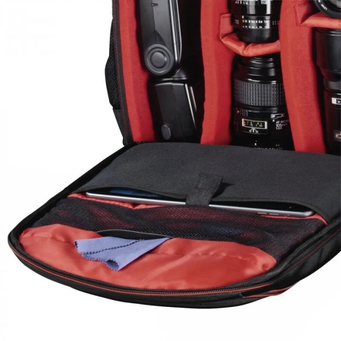 Mochila Hama modelo Miami 190 diseñada para proteger y llevar todo tu equipo fotográfico cómodamente, con 6 compartimentos internos extraíbles y acolchados para proteger la cámara y todos sus accesorios.