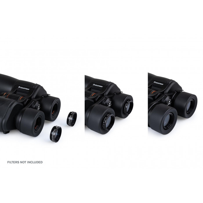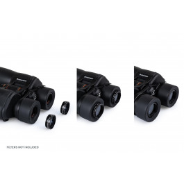 Dispone parasoles desmontables con tapa giratoria en ambos oculares, ideal para los usuarios de gafas, también es posible enroscar filtros astronómicos, como los de reducción de la contaminación lumínica o filtros polarizadores, a través de la rosca especial de 31,8 mm (estándar astronómico 1,25”).