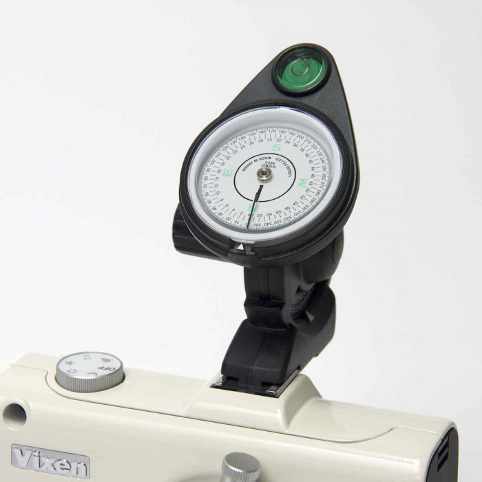 El polar Meter es una brújula con un nivel de burbuja y una escala de altitud utilizada para la localización de la estrella Polar con facilidad. Se acopla a la zapata de accesorios del Vixen Polarie.