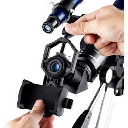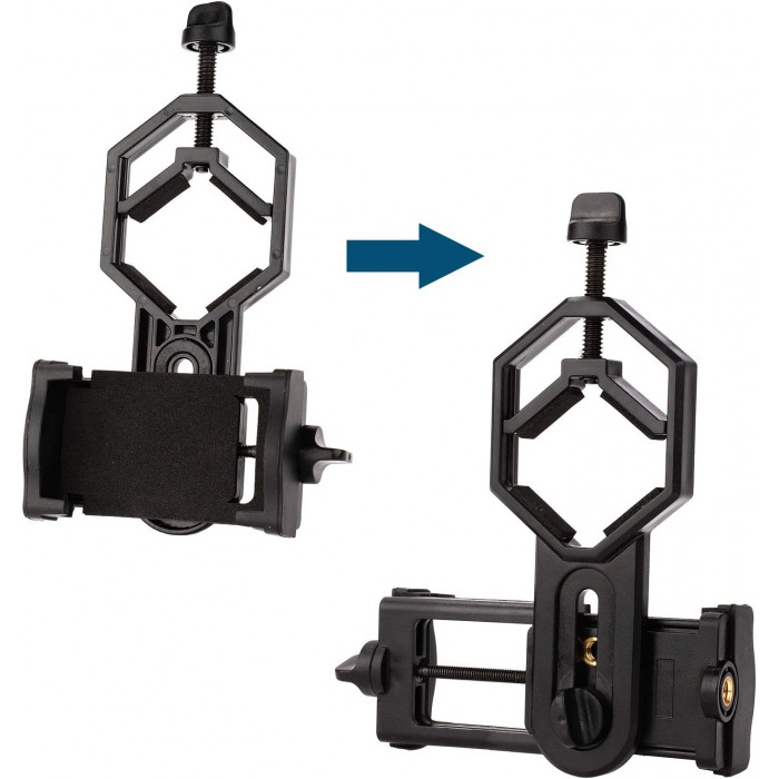Este adaptador de teléfono se instala fácilmente al sujetarlo sobre la parte superior de un ocular. El teléfono se mantiene en posición con la ayuda de las perillas que bloquean firmemente el teléfono en su lugar. Es posible que se deban quitar algunas carcasas de teléfonos grandes y / o voluminosas (incluidas las de estilo folio) para que el teléfono encaje en el adaptador.