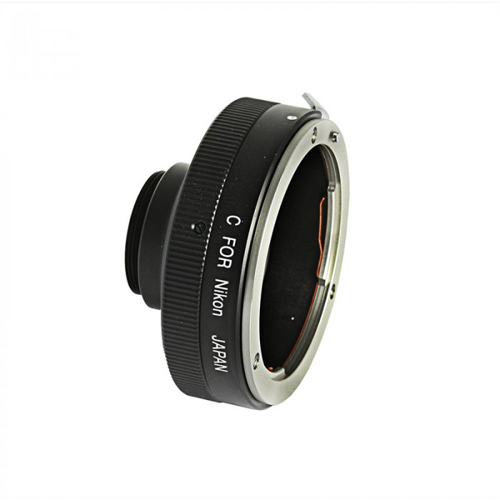 Adaptador fotográfico Baader Planetarium para usar cámaras de video con rosca C y objetivos Nikon. Éste adaptador tine una bayoneta tipo Nikon donde podemos colocar el objetivo, y al otro extremo, una rosca tipo C para colocar la cámara.