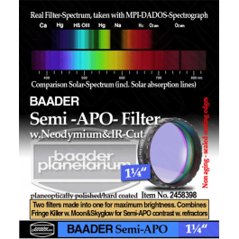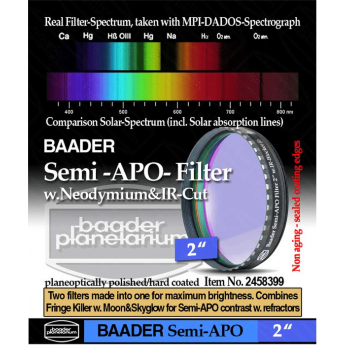 Este filtro de 2" es la más reciente novedad en cuanto a filtros correctores de cromatismo se refiere de Baader Planetarium. Tal y como su nombre indica, el filtro Semi-Apo ofrece una imagen neutra, reduciendo enormemente los contornos violetas característicos de los sistemas acromáticos.
