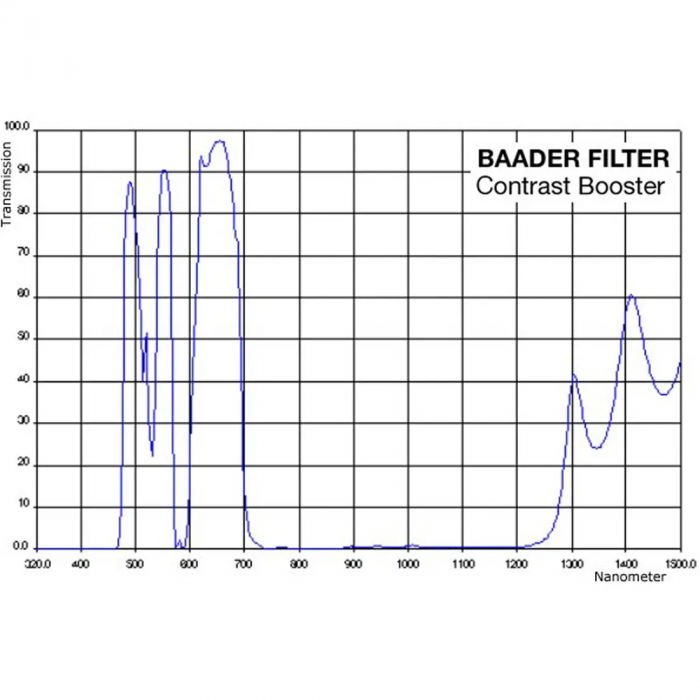Filtro Baader Planetarium de reducción de cromatismo y polución lumínica de 1.25". El filtro Contrast Booster es mucho más que un simple Minus Violet, basado en el popular filtro Baader Moon & SkyGlow, éste filtro consigue unos niveles de contraste y reducción del brillo, del fondo del cielo, provocado por la Luna, nunca antes conseguidos por un filtro óptico.