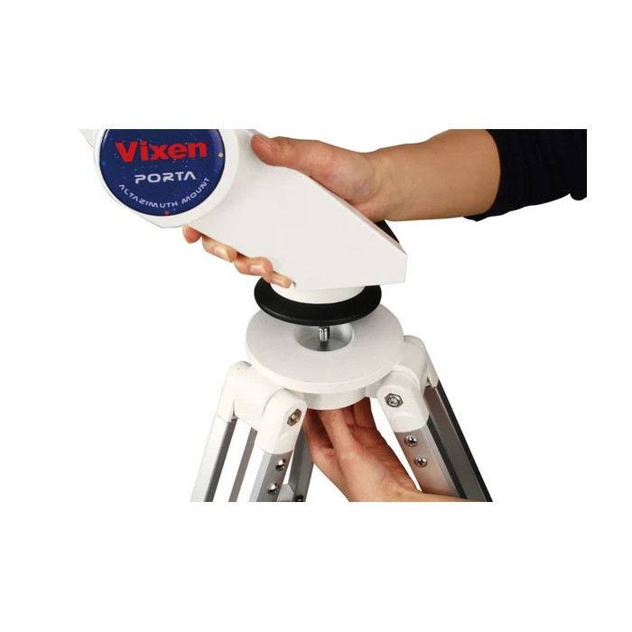 La montura altacimutal Porta II de Vixen se monta rápidamente. Es muy portátil y fácil de usar. La Porta II es la hermana mayor de la montura Mini-Porta y se puede girar el telescopio a mano en las direcciones vertical y horizontal. El peso de la montura con el trípode pesa 5,8 kg. Puede montar su telescopio en menos de un minuto con la Porta II.