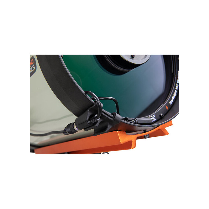 El anillo calentador de rocío también viene con un clip para organizar los cables, que se conecta a la celda frontal del telescopio. Dispone de un canal donde insertar el conector de alimentación y transmisor, para evitar que los cables cuelguen, y reducir así los tirones no deseados en los conectores del cable y anillo.