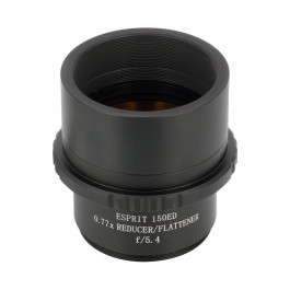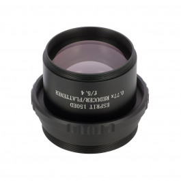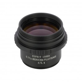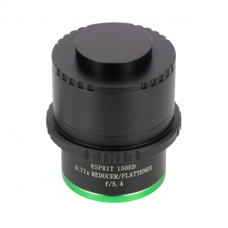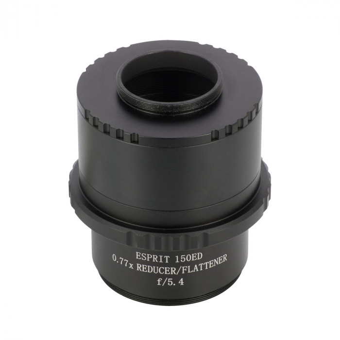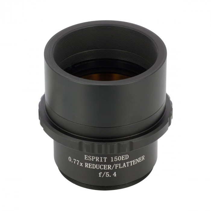Los propietarios de los telescopios apocromáticos Sky-Watcher Esprit 150ED ahora pueden obtener imágenes con una distancia focal reducida. Aunque la distancia focal nominal de f/ 7 no es excesiva, siempre es bueno poder reducir los tiempos de exposición o aumentar la relación señal/ruido (la relación focal pasa entonces a ser de f/ 5,4). Gracias a una construcción alrededor de un triplete óptico bellamente elaborado (tratado multicapa), este reductor de 0,77x aplana el campo en un círculo de imagen de 34 mm (compatible con cámaras digitales en formato APS-C). Las estrellas son entonces puntuales en el borde del campo (como con el corrector incluido a la salida del 150ED Esprit al que reemplaza).